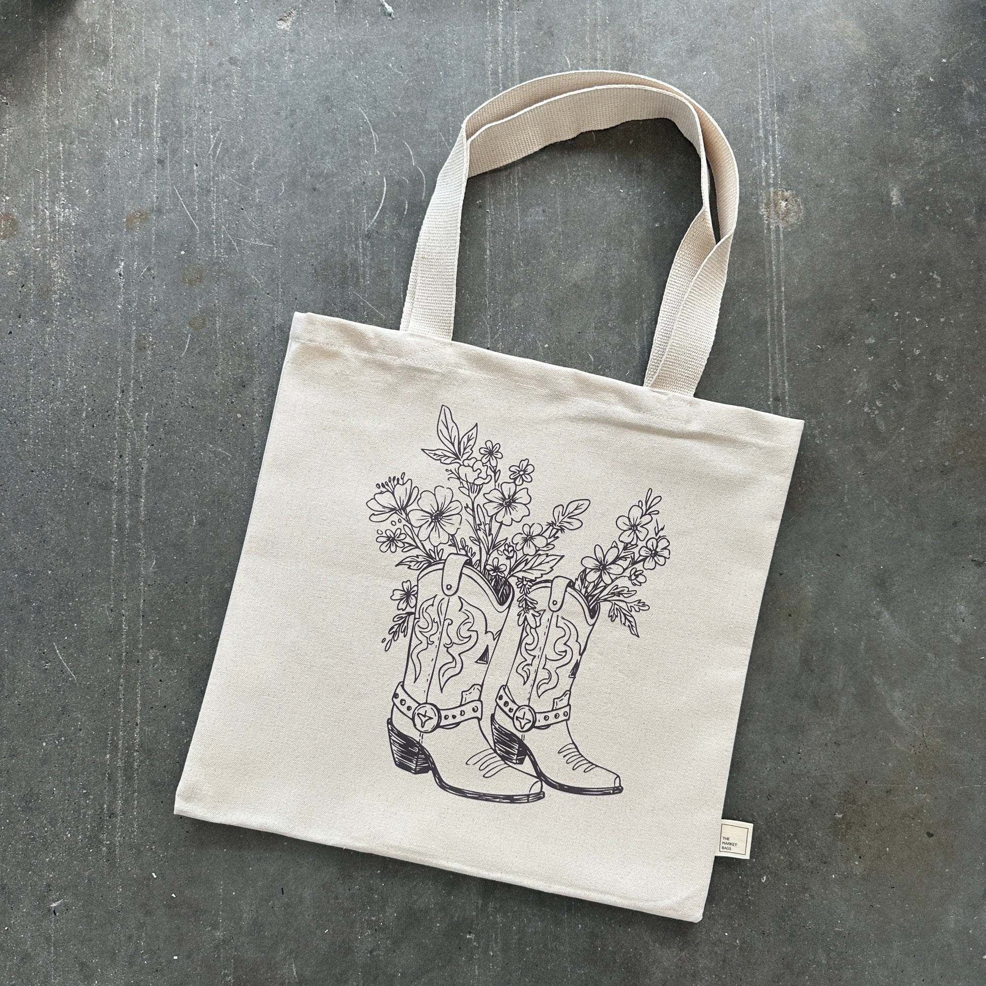 A western twist with a soft side. This oversized tote is made in Canada from 100% recycled cotton canvas and features a the cutest cowgirl graphic! Durable, sustainable, ad eco-friendly.