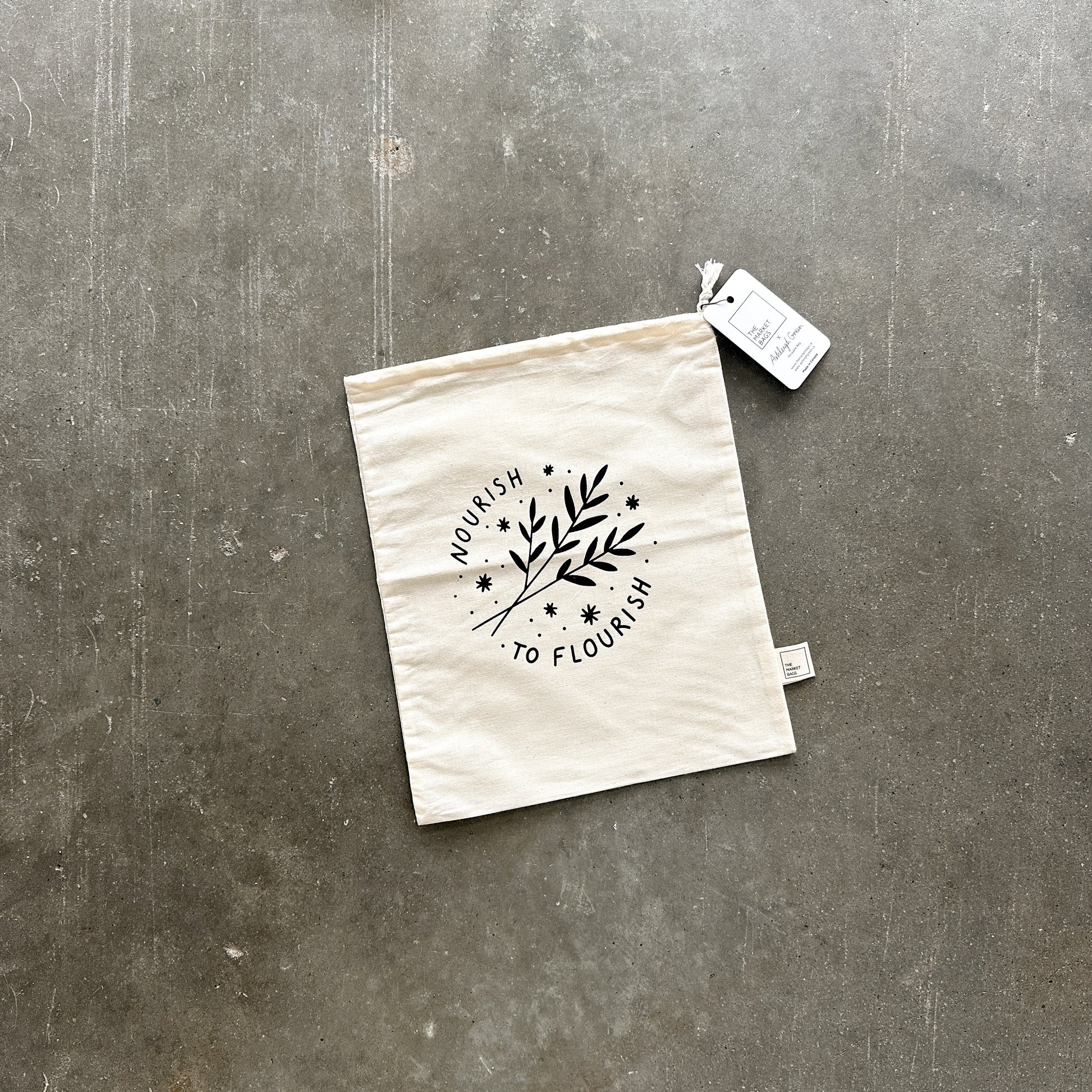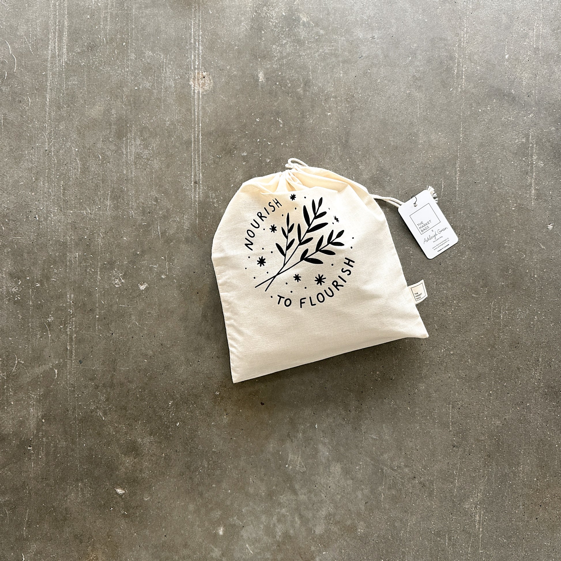 Our organic cotton reusable muslin produce bags have a playful upgrade! Featuring a fun + positive design by local illustrator Ashleigh Green, this bag is both stylish and sustainable. Perfect for carrying your fresh produce and groceries! Shop now and add some fun to your sustainable lifestyle!